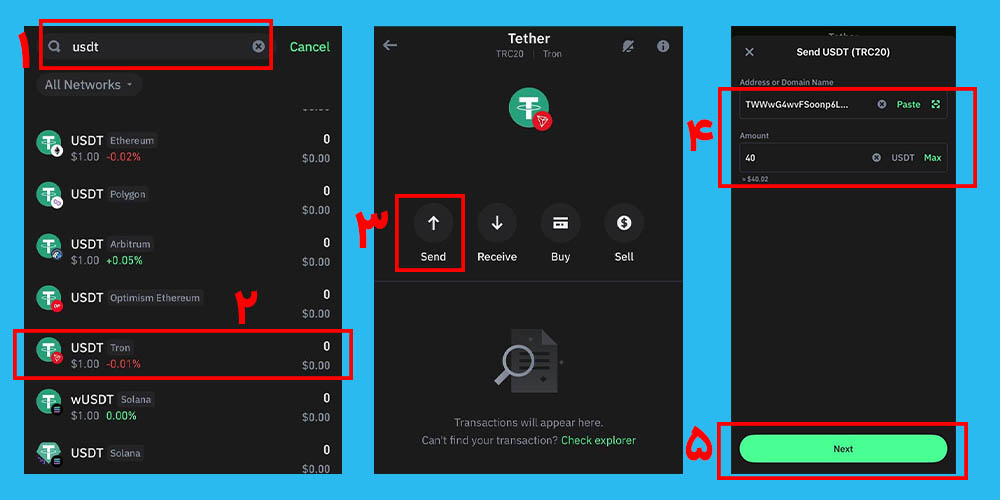 در قسمت “Address”، آدرس کیف پول مقصد را وارد کنید. دقت کنید آدرس مقصد نیز باید بر بستر شبکه ترون (TRC20) باشد؛ در غیر این صورت سرمایه از دست خواهد رفت. در بخش “Amount” نیز مبلغ مورد نظر را وارد کنید و سپس بر روی گزینه “Next” کلیک کنید.