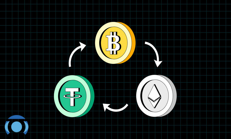آربیتراژ مثلثی اختلاف قیمت بین سه جفتارز دیجیتال در یک صرافی استفاده میشود. این استراتژی معمولاً در صرافیهایی با تعداد زیادی جفت معاملاتی امکانپذیر است. تصور کنید که در یک صرافی، نرخ تبدیل BTC/ETH، ETH/USDT و BTC/USDT دارای اختلافاتی است. شما میتوانید ابتدا بیتکوین را به اتریوم تبدیل کنید. در ادامه، اتریوم را به USDT و در نهایت USDT را مجدداً به بیتکوین تبدیل کنید و سود ببرید.
